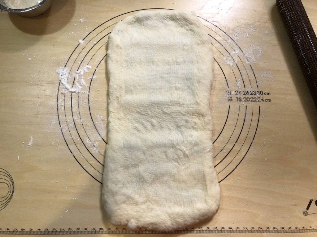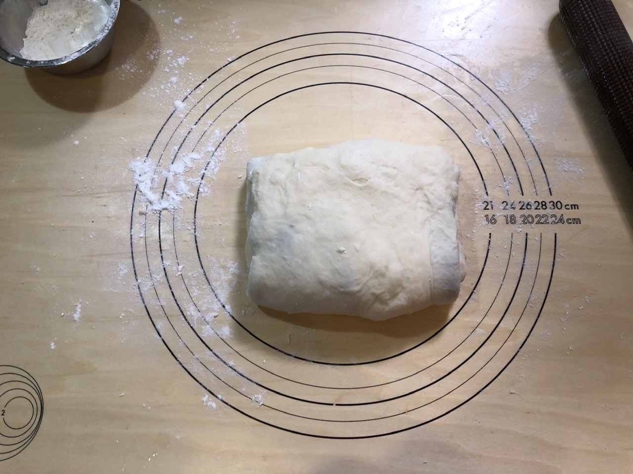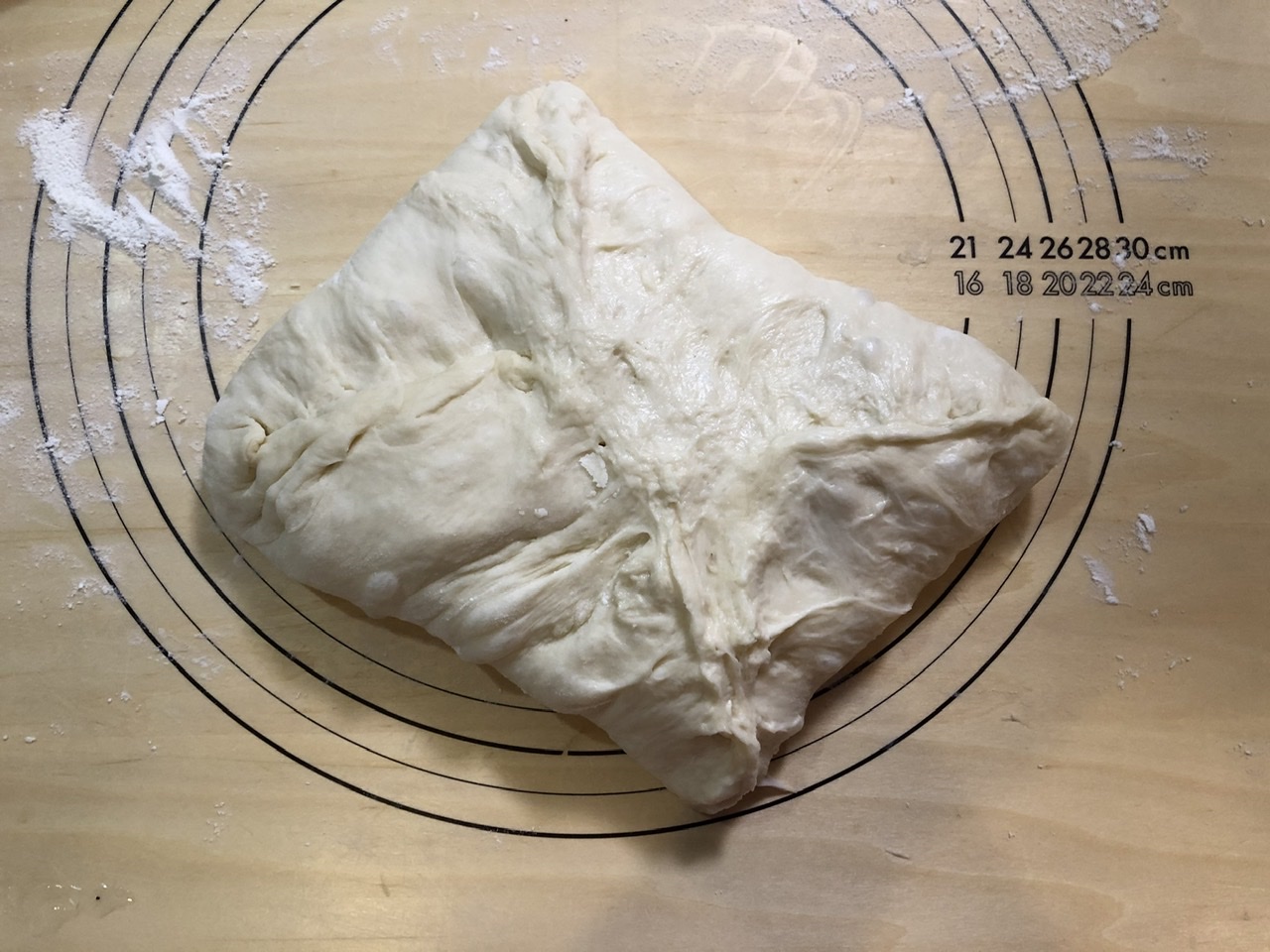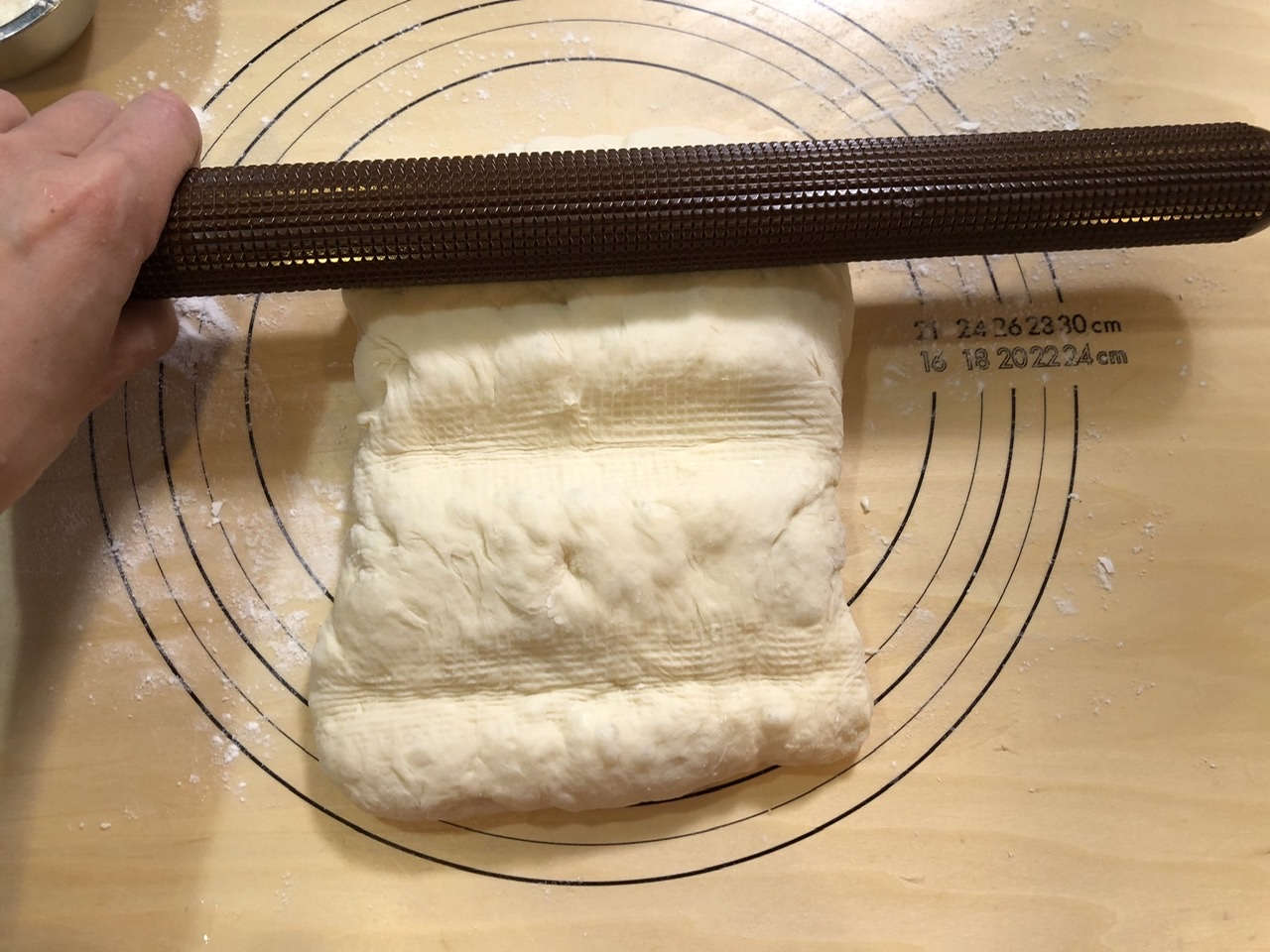 ・3つ折りを2回にしていますが、お好みで3回にしても。折り込み回数が多いほど、層が多くなって細かなマーブル模様となります。一方で、1層1層のパン生地が薄くなるともいえます。作り比べてみて、お好きな回数折り込んでみましょう。