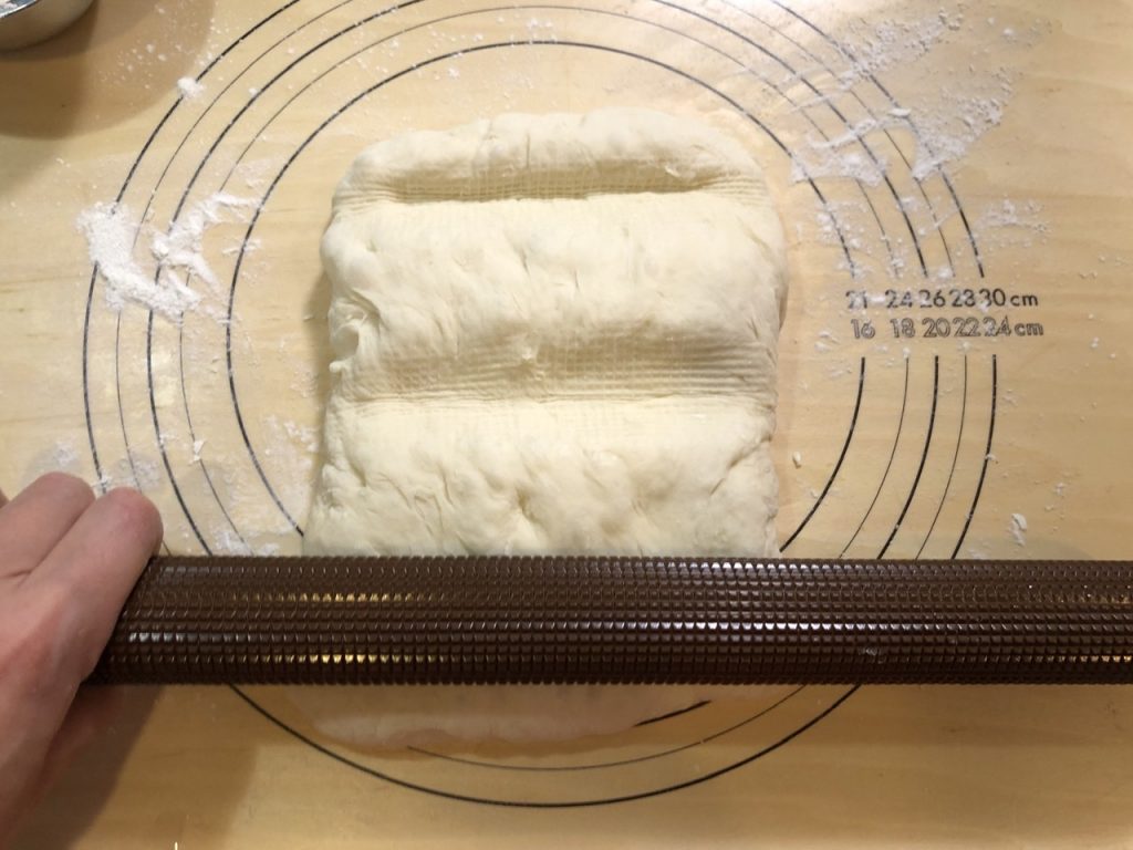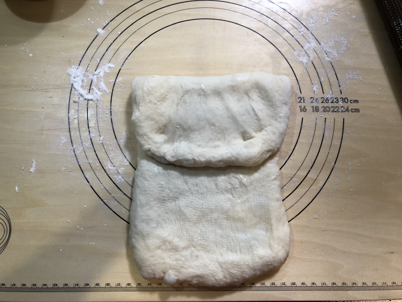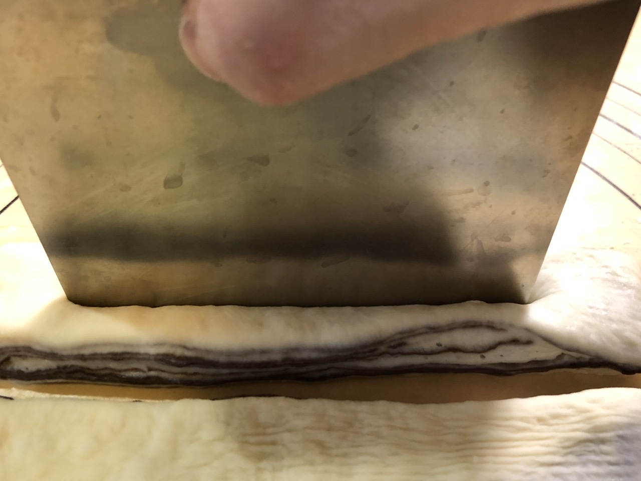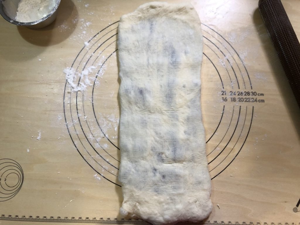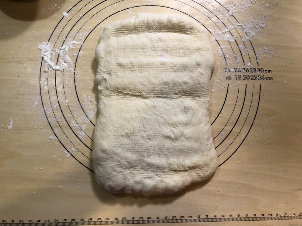 ・3つ折りを2回にしていますが、お好みで3回にしても。折り込み回数が多いほど、層が多くなって細かなマーブル模様となります。一方で、1層1層のパン生地が薄くなるともいえます。作り比べてみて、お好きな回数折り込んでみましょう。