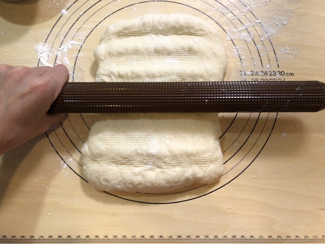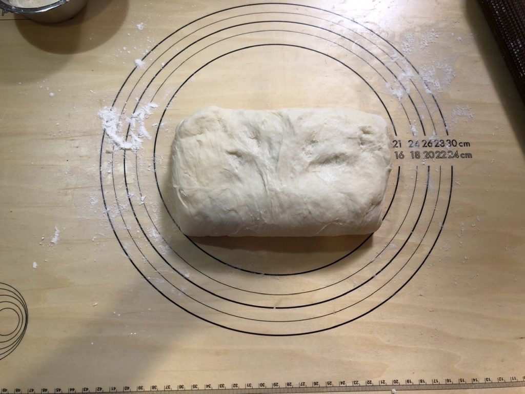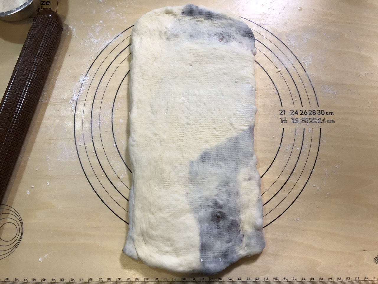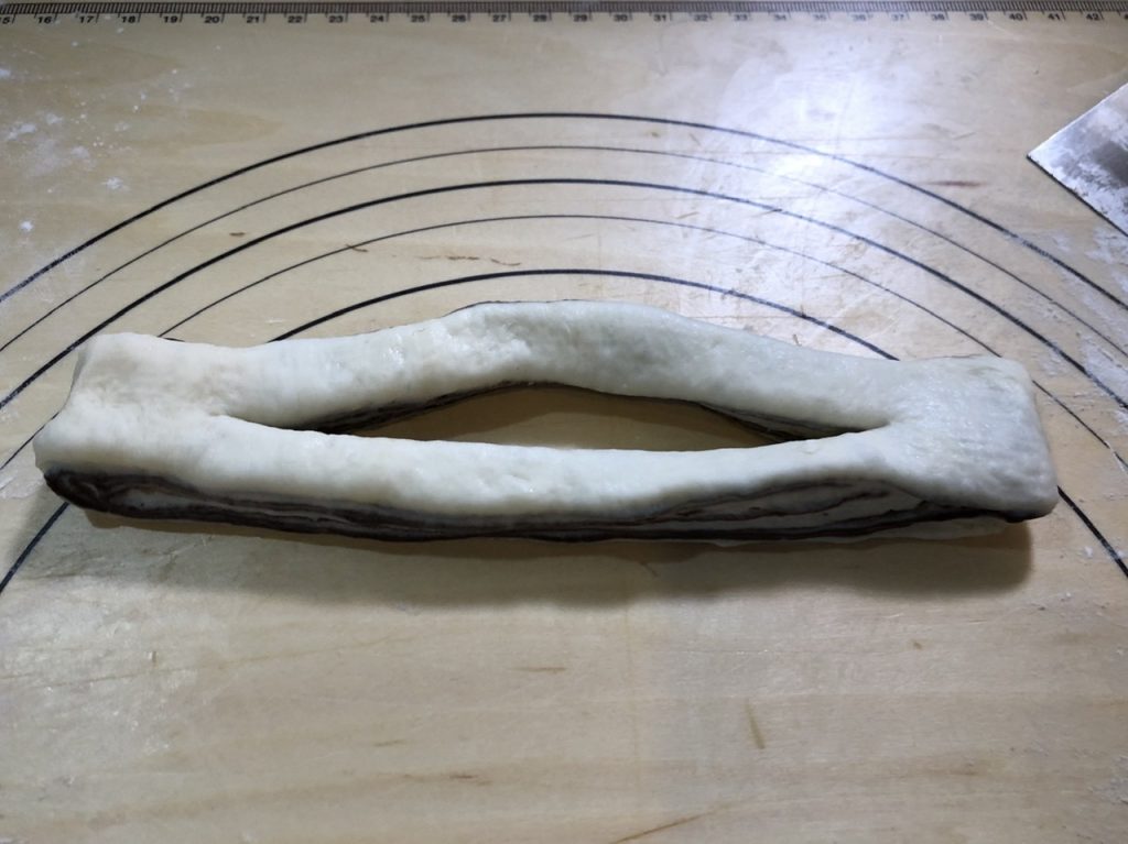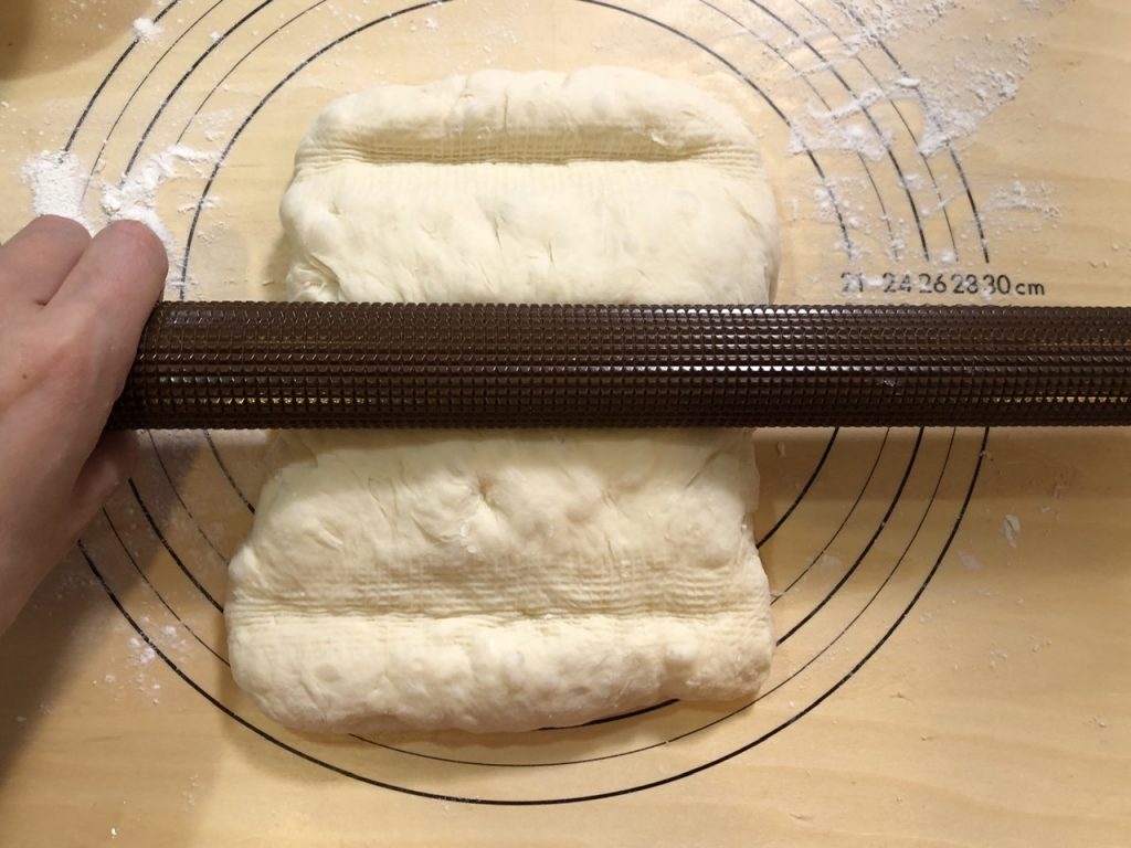 ・3つ折りを2回にしていますが、お好みで3回にしても。折り込み回数が多いほど、層が多くなって細かなマーブル模様となります。一方で、1層1層のパン生地が薄くなるともいえます。作り比べてみて、お好きな回数折り込んでみましょう。
