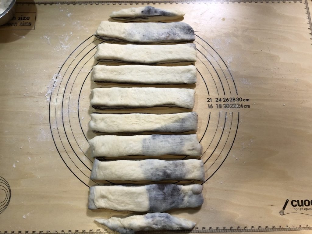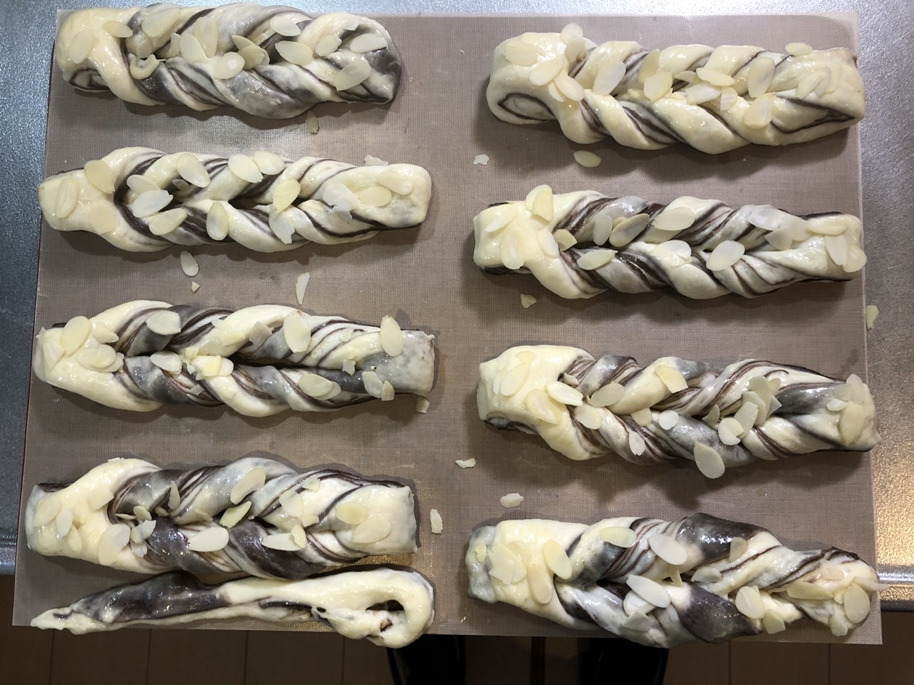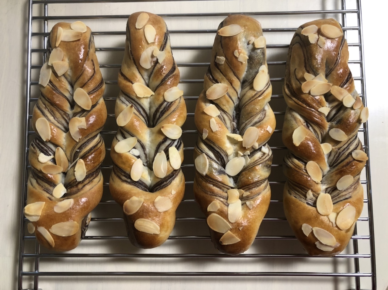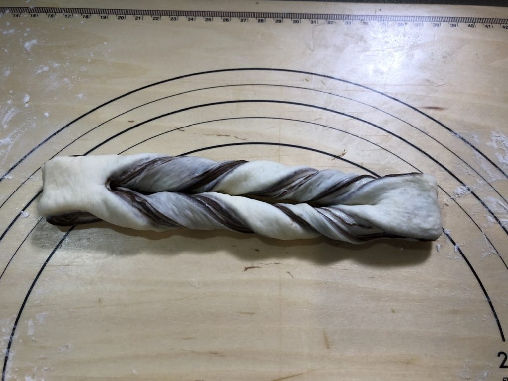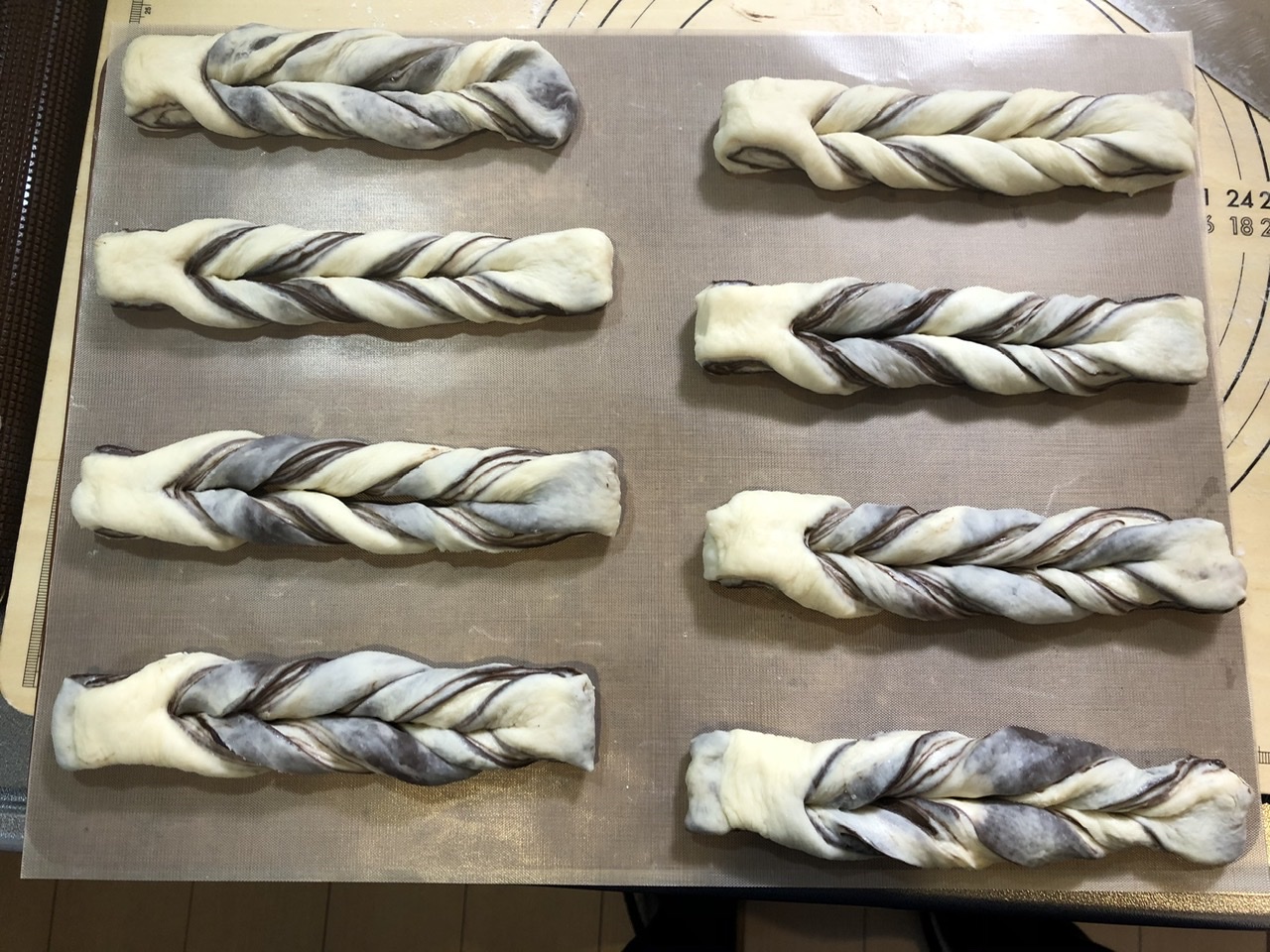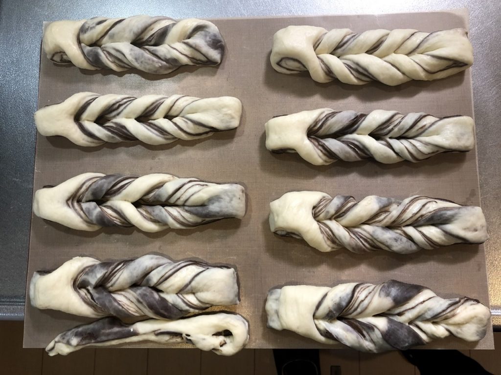 ツマの菓子パン生地を使って、マーブル模様が美しい、チョコマーブルパンを焼きました。マーブルシートを使うとあっという間にプロのようなパンが焼けます。