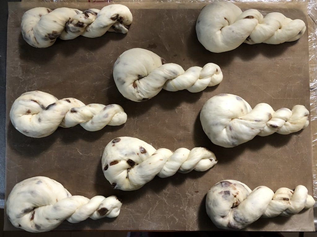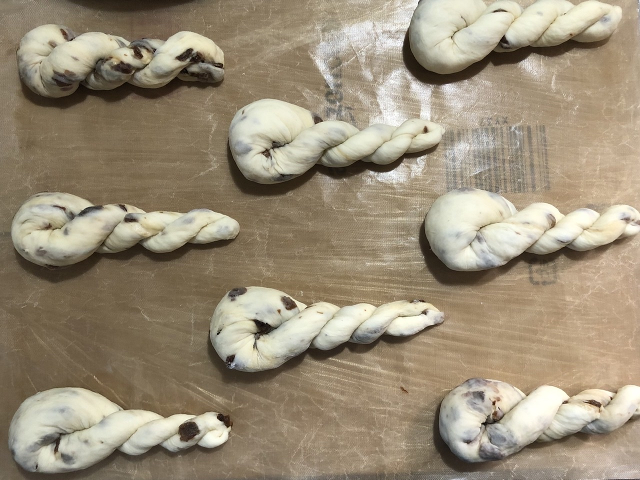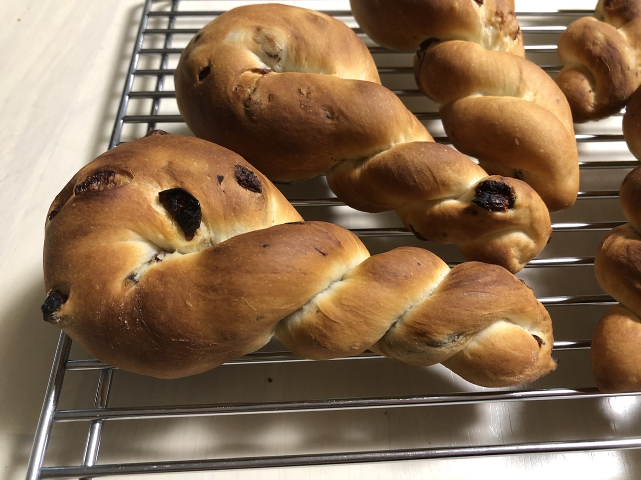 ツマのミルクパン生地にレーズンを混ぜ込んて、レーズンツイストを焼きました。私が働いていたパン屋さんはでこれを揚げてレーズンドーナツにしていました。懐かしい~。