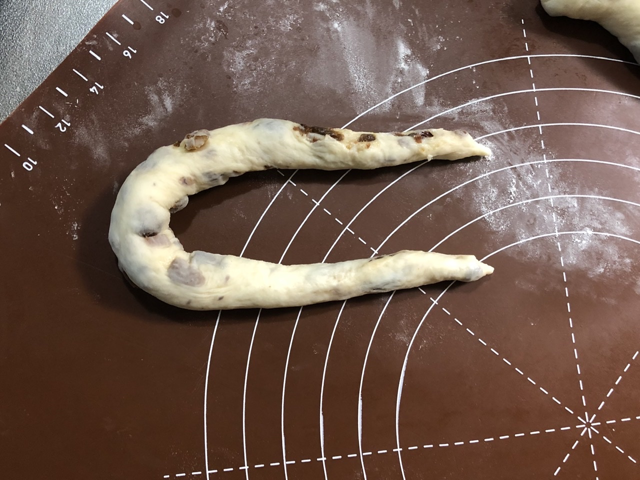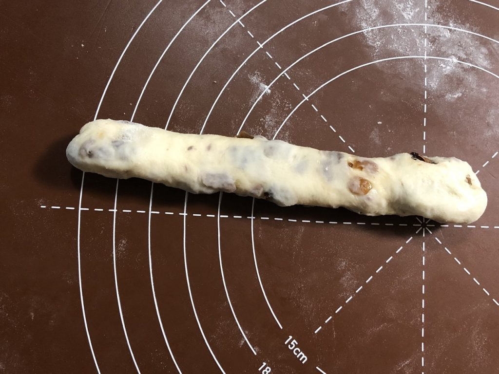 ・レーズンはなるべく生地表面に出てこないよう、成型時は気をつけてください。発酵しにくかったり、焼成で焦げてしまったりします。また真ん中を太くすることで食べ応えを、両端を細くすることでサクッ・カリッとした食感になり、1つのパンで2つの食感になります。