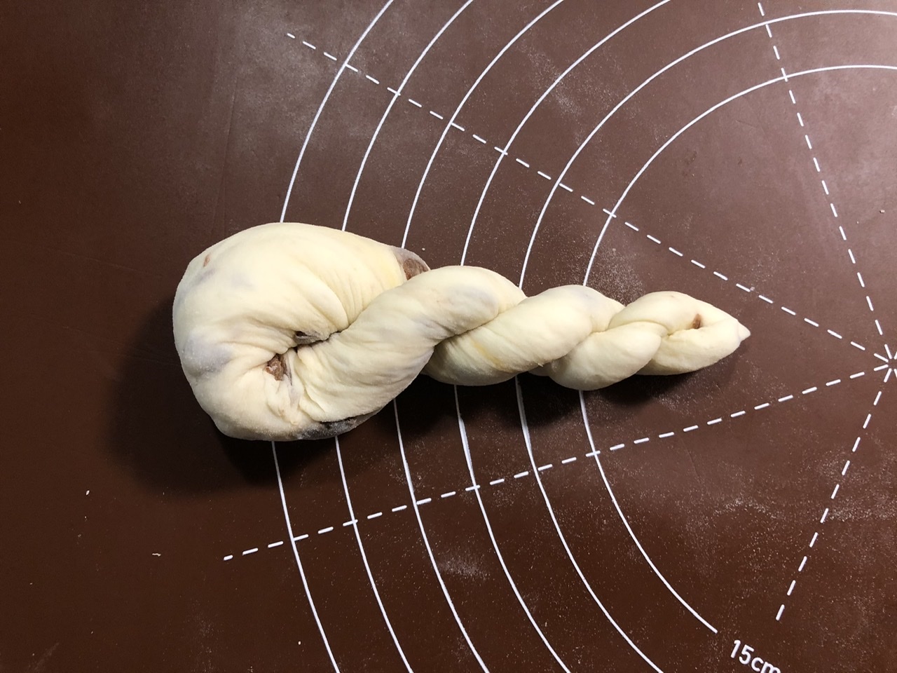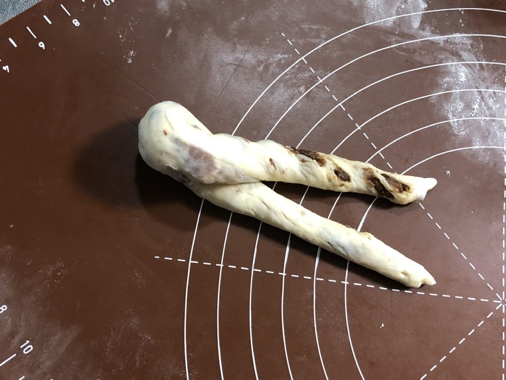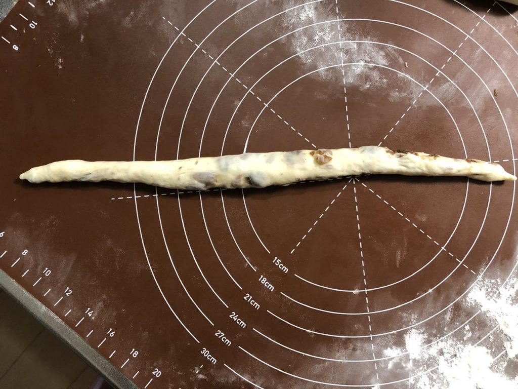 ・左手で手前に転がしながら、右手で生地を抑えつつ手前に転がして、ツイストにする