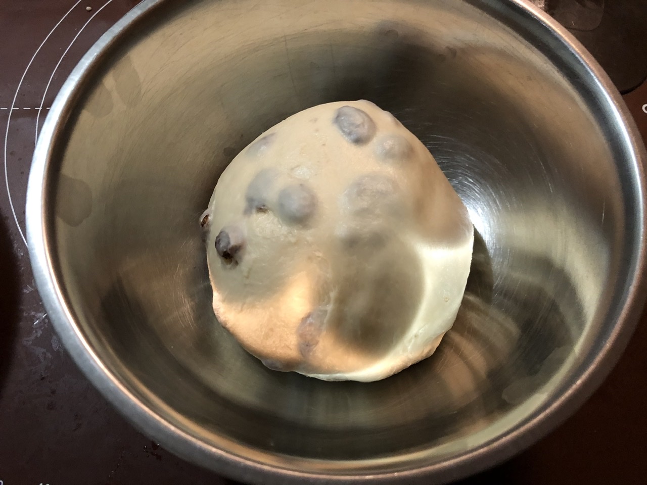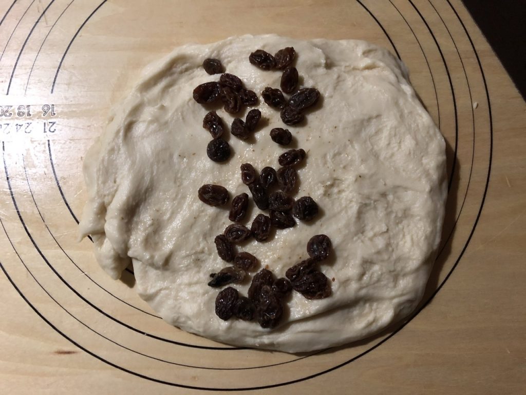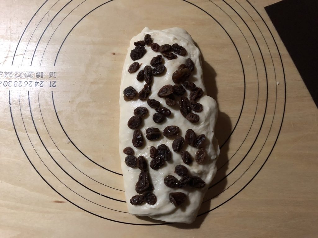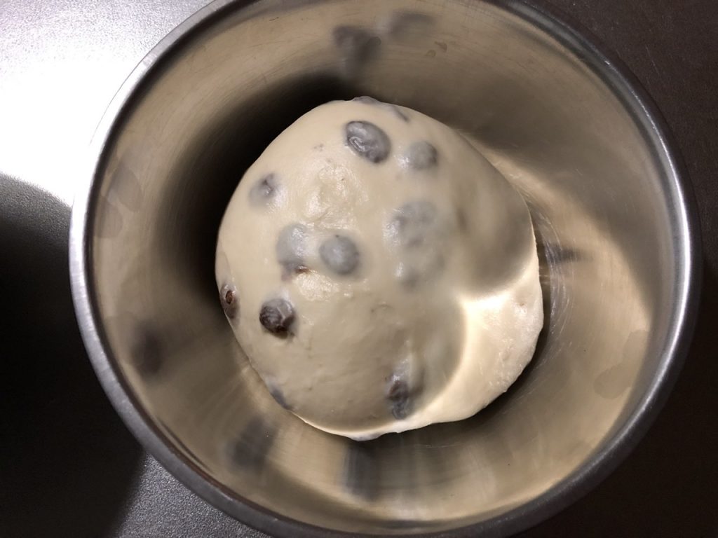 ・レーズンを混ぜ込むと、混ぜ込まない生地を比較すると発酵しずらくなります(レーズンでガスがつぶれてしまうため、膨らみにくくなる)ので、生地は優しく扱ってください。