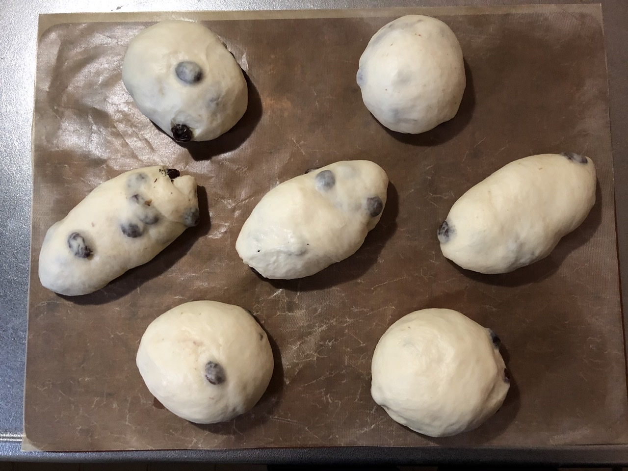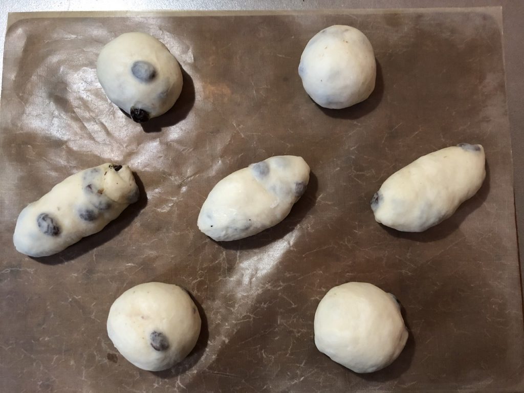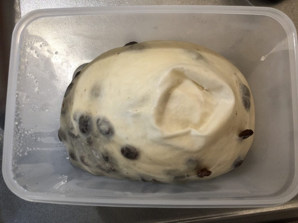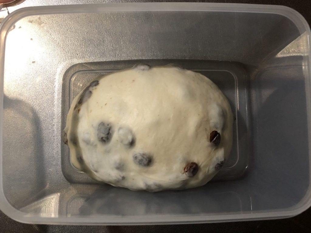 ・レーズンを混ぜ込むと、混ぜ込まない生地を比較すると発酵しずらくなります(レーズンでガスがつぶれてしまうため、膨らみにくくなる)ので、生地は優しく扱ってください。
