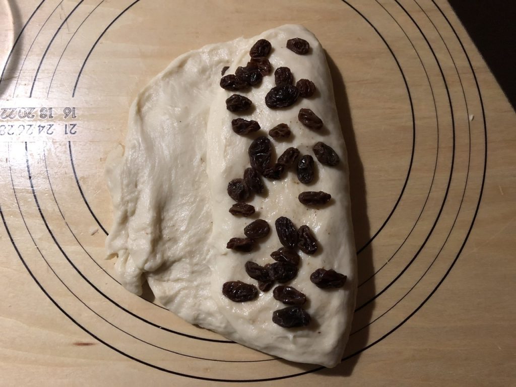 ↓右から生地を1/3おりたたみ、レーズンの1/3をのせる